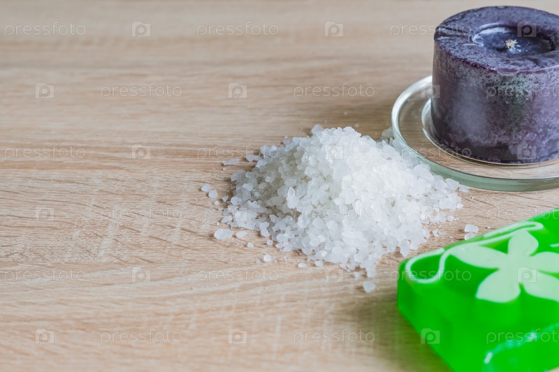 Куча морской соли, мыла и черной свечи на деревянном столе. Натуральный ингредиент для спа и пилинга. Копировать пространство