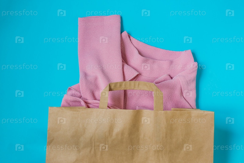 Розовая женская блузка в бумажном ремесленном пакете на синем фоне. Продажа одежды и концепция черной пятницы. Вид сверху