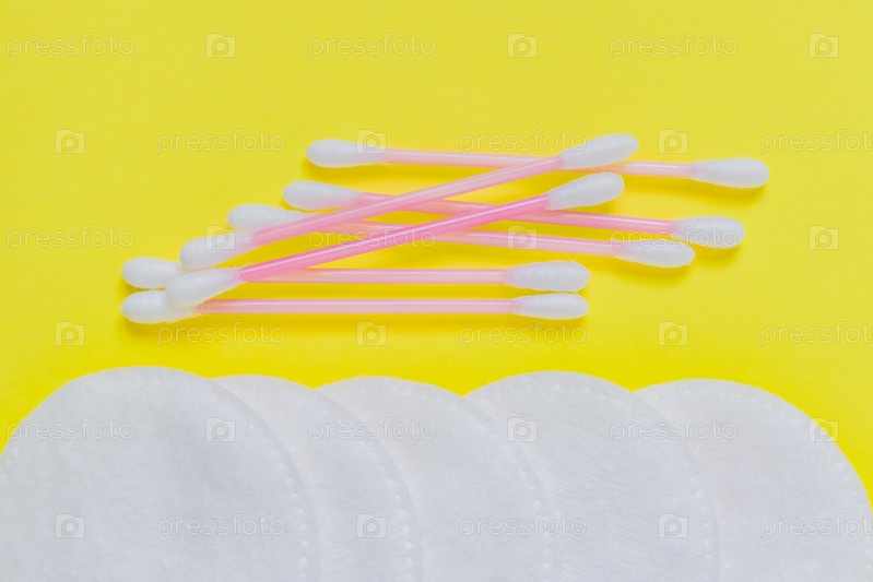 Косметические ватные диски и ватовые палочки на белом фоне.Сделайте концепцию yp и уход за кожей
