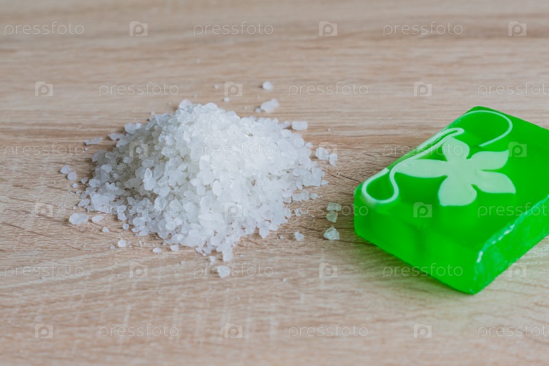 Куча морской соли и мыла на деревянном столе. Натуральный ингредиент для спа и пилинга. Копировать пространство