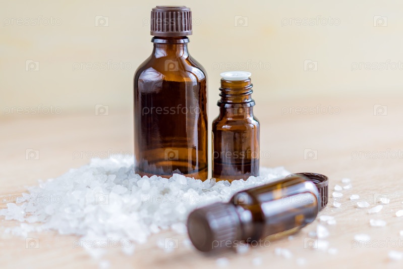 Куча морской соли и бутылки с ароматическим эфирным маслом на деревянном столе. Натуральные ингредиенты для спа и пилинга