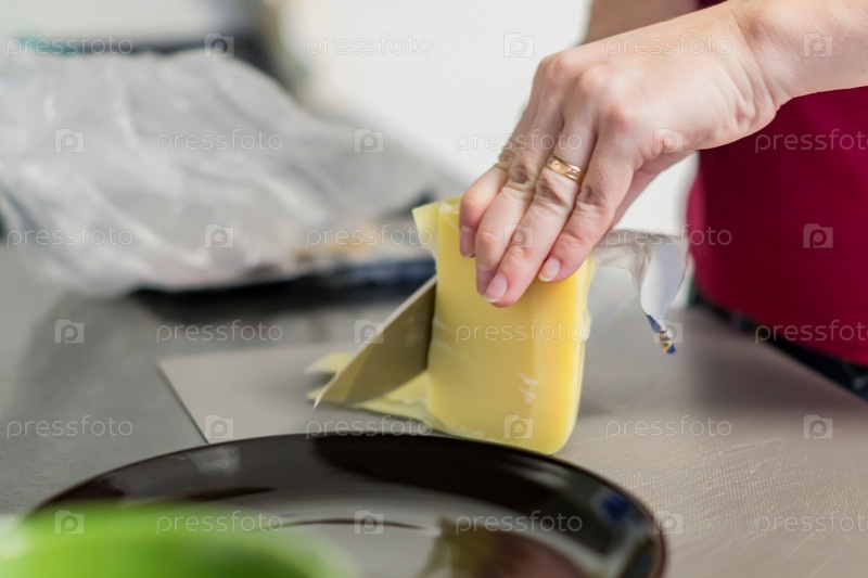 Ломтики сыра на разделочной доске, женщина готовит бутерброды на завтрак