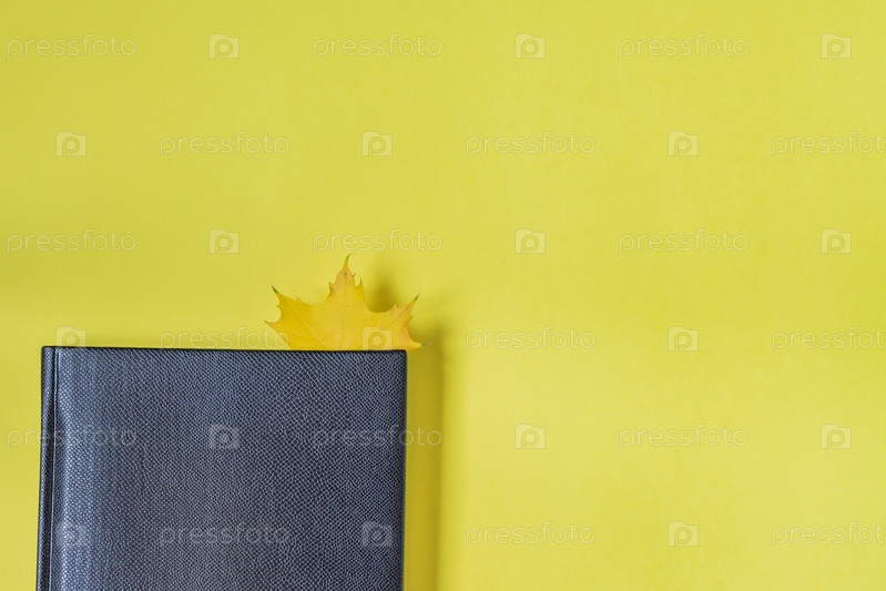 Блокнот из искусственной кожи рептилий черного цвета с кленовым листом в качестве закладки на желтом фоне