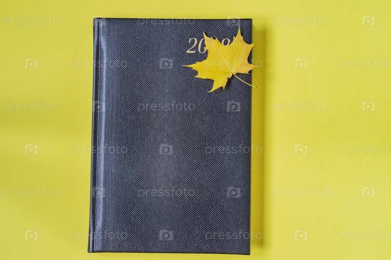Блокнот из искусственной кожи рептилий черного цвета с кленовым листом в качестве закладки на желтом фоне