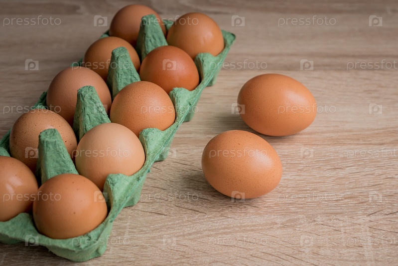 Закройте сырых коричневых куриных яиц в картонной коробке для яиц на деревянном столе