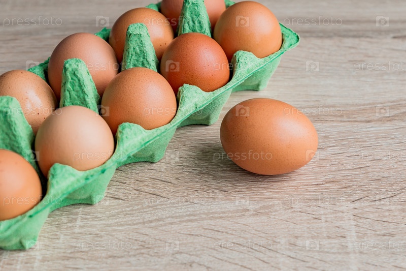 Закройте сырых коричневых куриных яиц в картонной коробке для яиц на деревянном столе