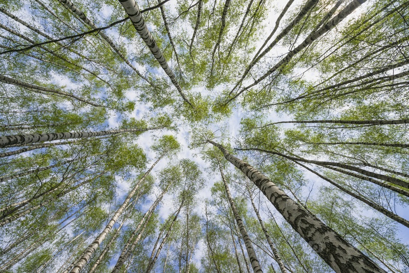 Березовый лес ранней весной, деревья на фоне неба