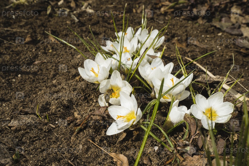 Цветущие цветы крокуса и первая пчела