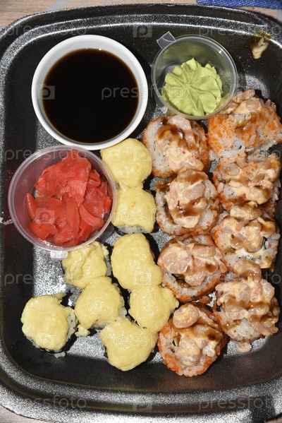 Запеченные роллы и суши с мясом и сыром со специями. Вкусный завтрак на подложке из роллов и суши с мясом