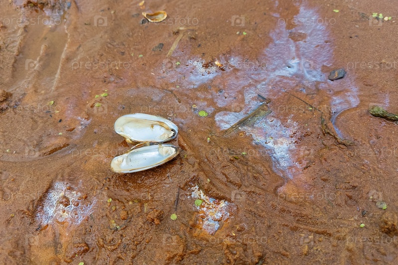 Пятна открытой раковины и бензина на песке на берегу реки. Концепция загрязнения окружающей среды