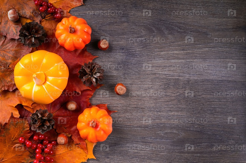 Осенний фон с кленовыми листьями, тыквами, шишками, каштанами и рябиной