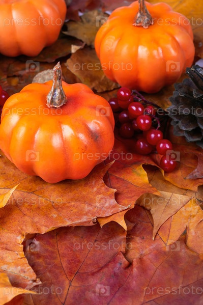 Осенний фон с кленовыми листьями, оранжевой тыквой, шишками, каштанами и рябиной