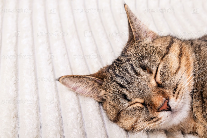Крупный план морды милой полосатой кошки, спящей на мягком уютном легком одеяле. Концепция отдыха и релаксации