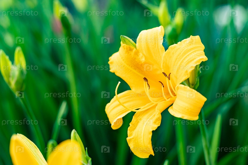 Цветок желтой лилии, растущий в летнем саду
