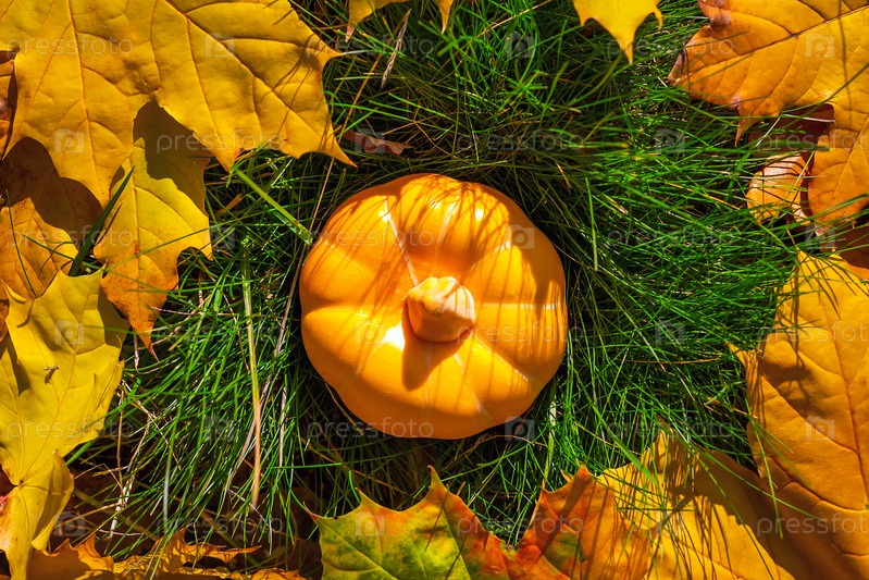 Тыквы на зеленой траве с желтыми и оранжевыми кленовыми листами