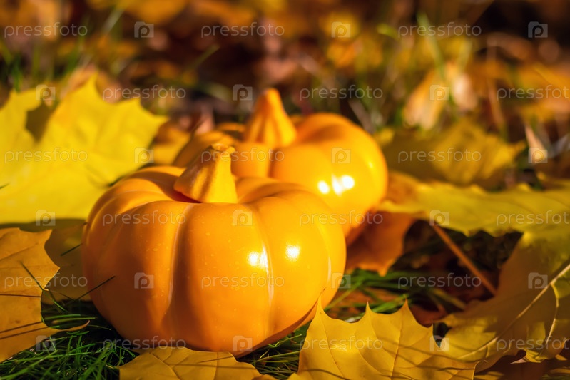 Тыквы на зеленой траве с желтыми и оранжевыми кленовыми листами