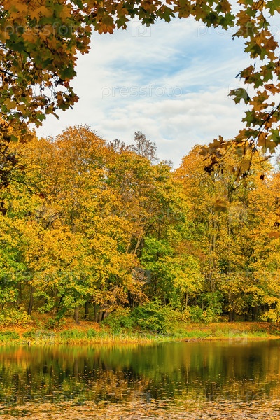 Осенний природный ландшафт лесного озера с деревьями с желтой листвой и опавшими листьями