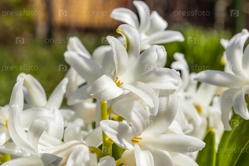Цветущий гиацинт с белыми лепестками бутонов и зелеными листьями. весенний цветок, крупный план
