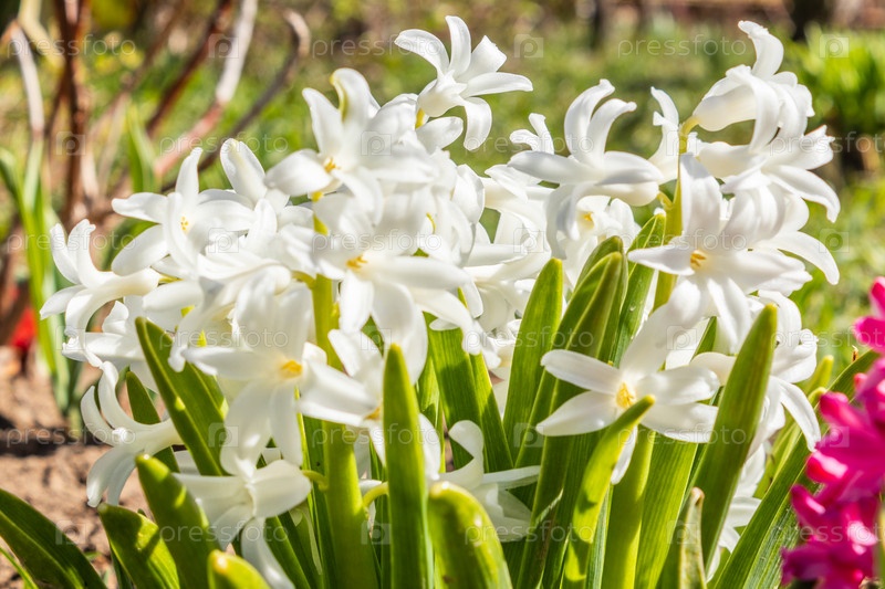 Цветущий гиацинт с белыми лепестками бутонов и зелеными листьями. весенний цветок, крупный план