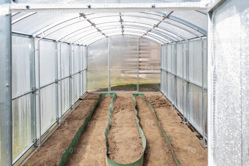 Теплица из поликарбоната на дачном участке готова к весенней посадке. Тульская область, Россия