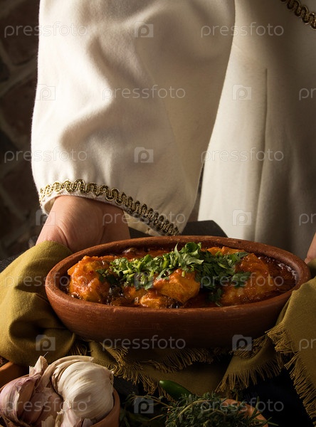 Официантка представляет тушеную курицу