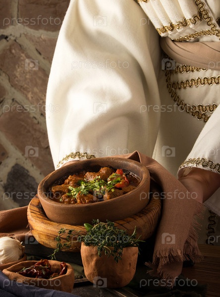 Вертикальный снимок официантки, предлагающей мясное рагу