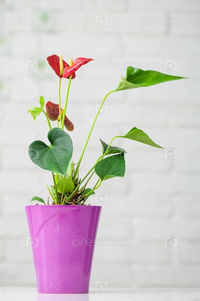 Вертикальный снимок красивых антуриумов в фиолетовом горшке на столе