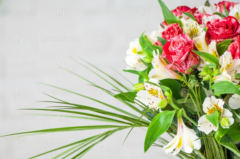 Крупный план красивого букета с розами и белыми альстромериями на белом фоне