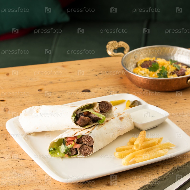 Крупный план шашлыков с овощами, завернутыми в лепешку