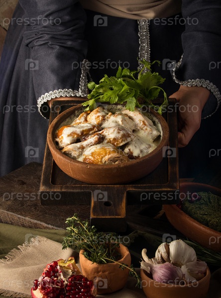 Вертикальный снимок официантки, представляющей курицу в сливочном соусе