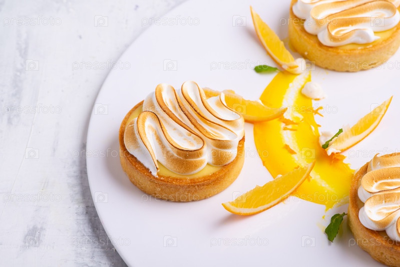Аппетитные лимонные тарталетки с безе подаются на белой тарелке