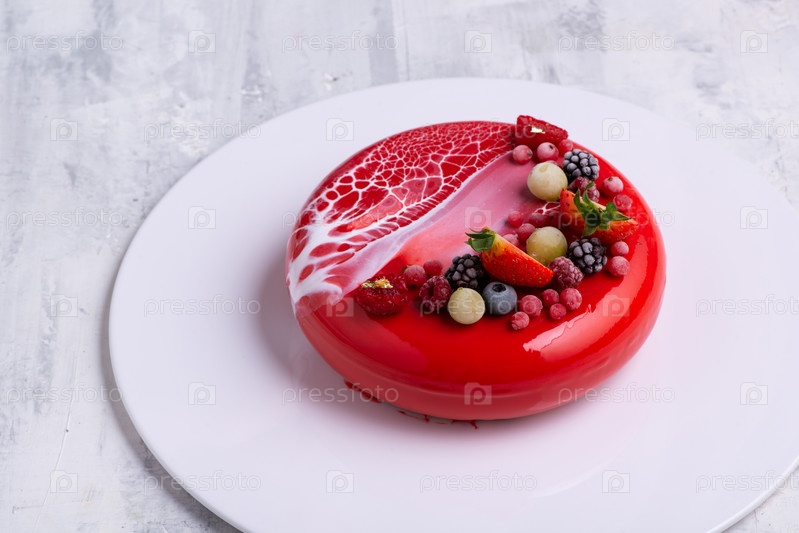 Угловой снимок торта с зеркальной глазурью, украшенного ягодами