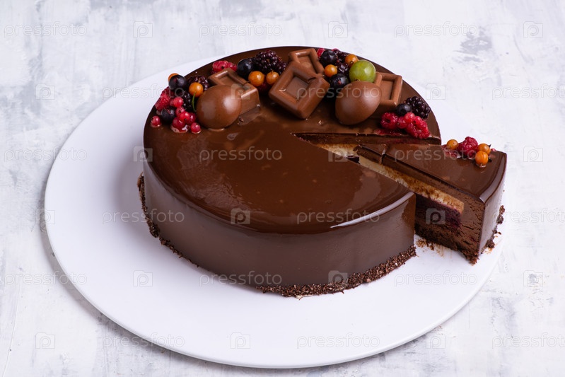 Угловой снимок торта с шоколадной глазурью, один вырезанный кусок которого украшен ягодами