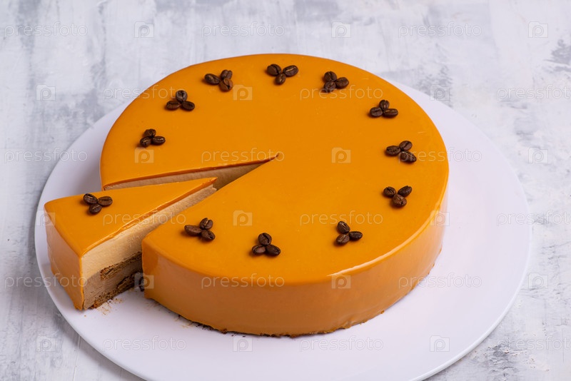 Крупный план вкусного желтого многослойного торта с жареными кофейными зернами