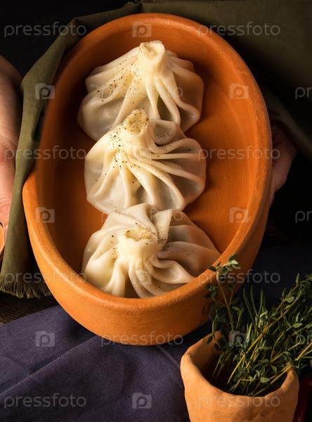 Вертикальный снимок роскошного столика в ресторане с изысканным блюдом из хинкали