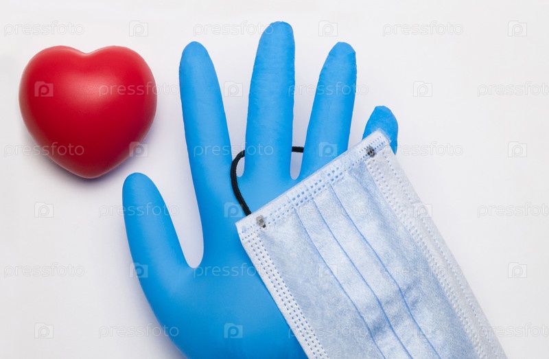 Антистрессовая пульсирующая губка в форме сердца рядом с медицинской перчаткой и маской