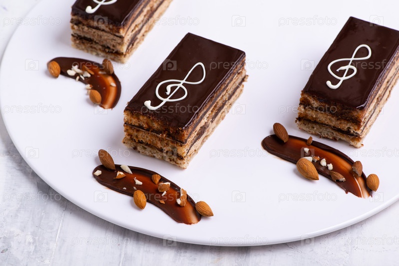 Порция вкусных кусочков шоколадного торта на белой тарелке
