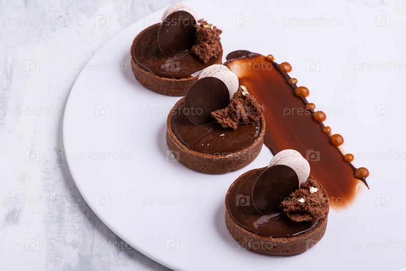 Крупный план вкусного шоколадного десерта с миндальным печеньем на белой тарелке