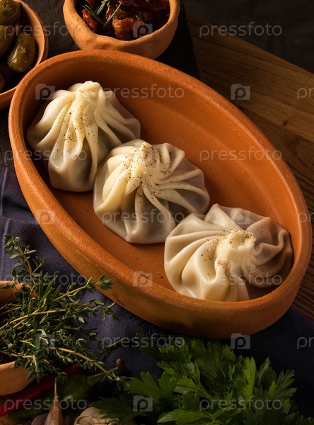 Вертикальный снимок роскошного столика в ресторане с изысканным блюдом из хинкали