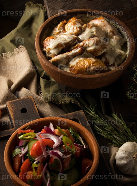 Вертикальный снимок курицы в сливочном соусе и салате из баклажанов