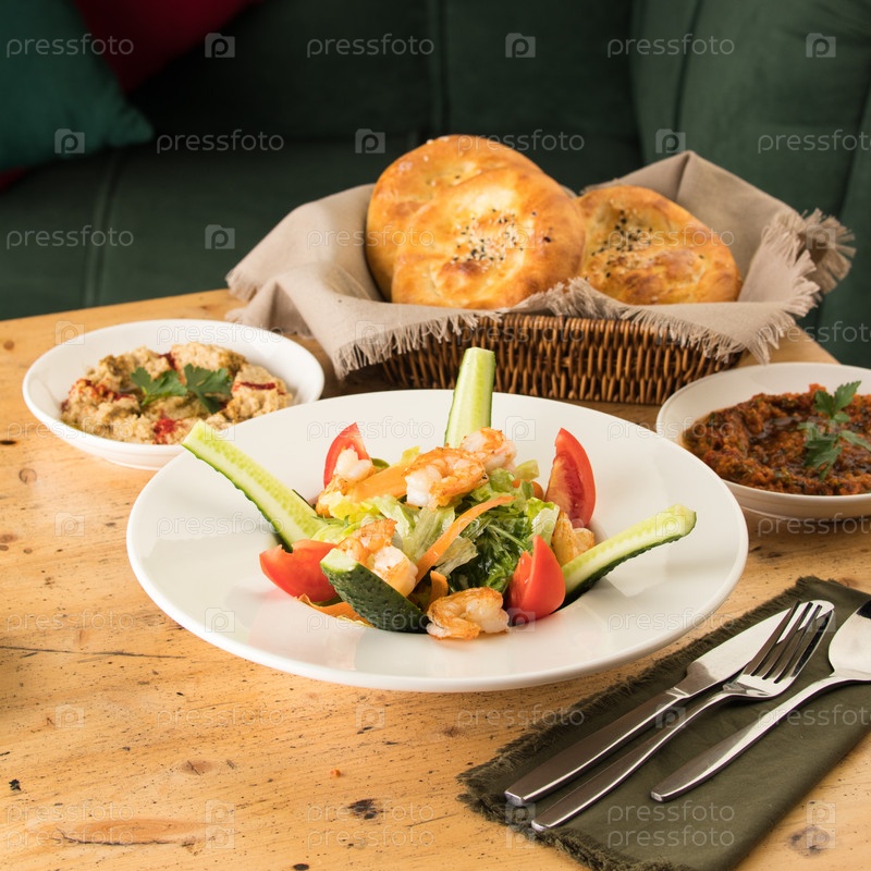 Обеденный стол, полный вкусного салата на белой тарелке рядом с корзиной хлеба