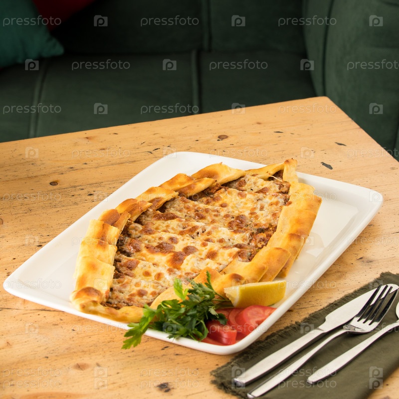 Традиционный турецкий запеченный пиде в белой тарелке на деревянном столе