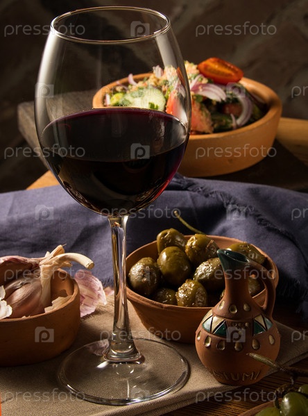 Бокал вина на столе с блюдами