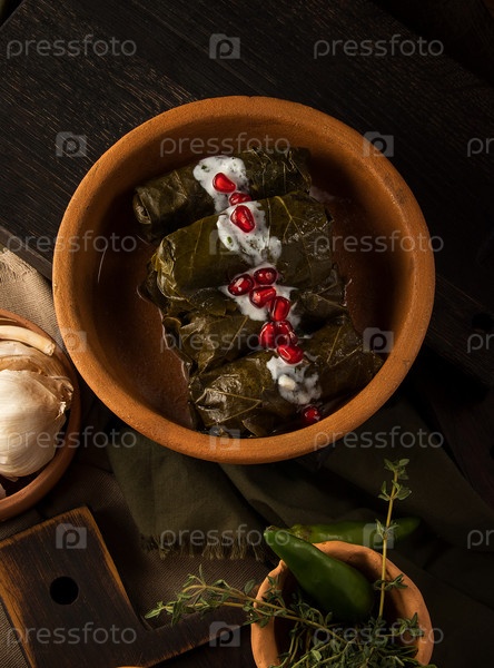 Вид сверху на долму, покрытую виноградными листьями