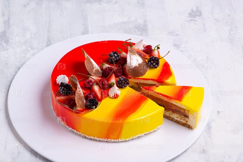 Крупный план вкусного торта с конфетами и свежими фруктами
