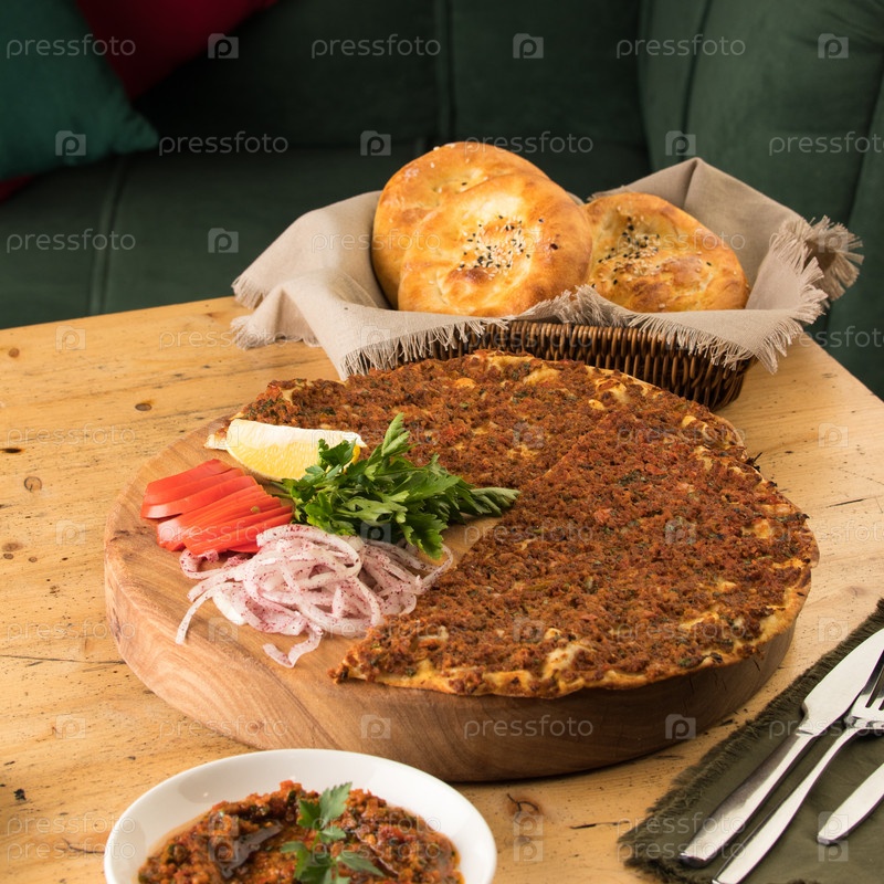 Крупный план лахмакуна и салата возле корзины с хлебом
