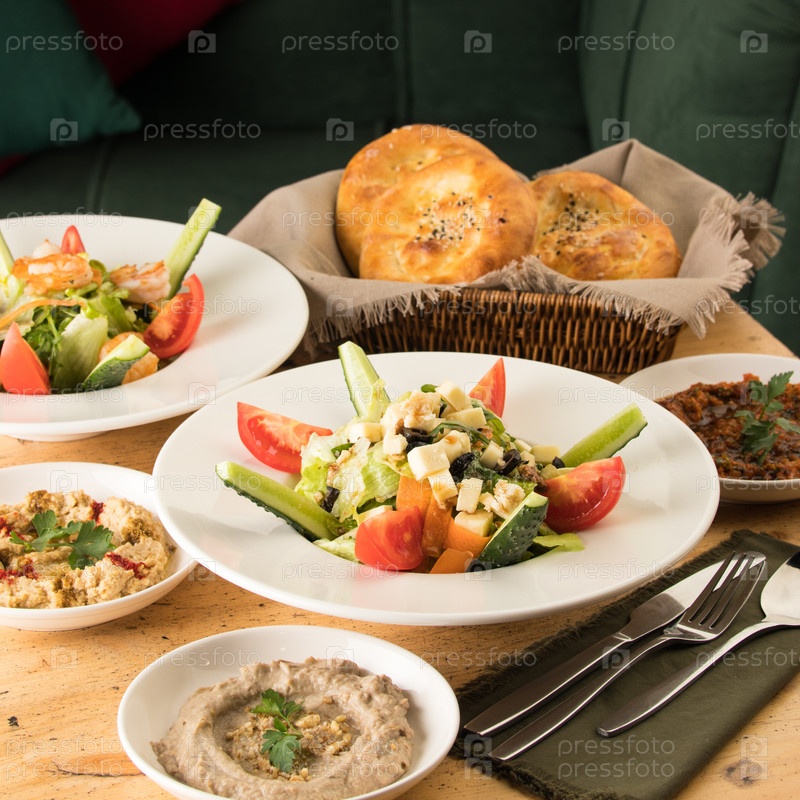 Обеденный стол, полный вкусного салата на белой тарелке рядом с корзиной хлеба