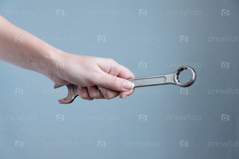 Женщина, держащая гаечный ключ в руке на сером фоне