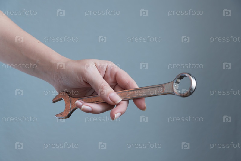 Женщина, держащая гаечный ключ в руке на сером фоне