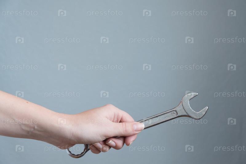 Женщина, держащая гаечный ключ в руке на сером фоне